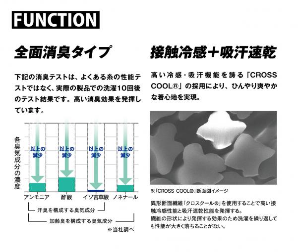 今回は、このCROSSCOOL®に、消臭ポリウレタン糸を製品全面にプラスしました。