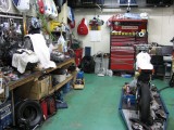 修理・カスタムエリアです。充分な工具と旋盤などの工作機械も設置して有ります。国家整備士が責任を持って納車整備や修理を致します。